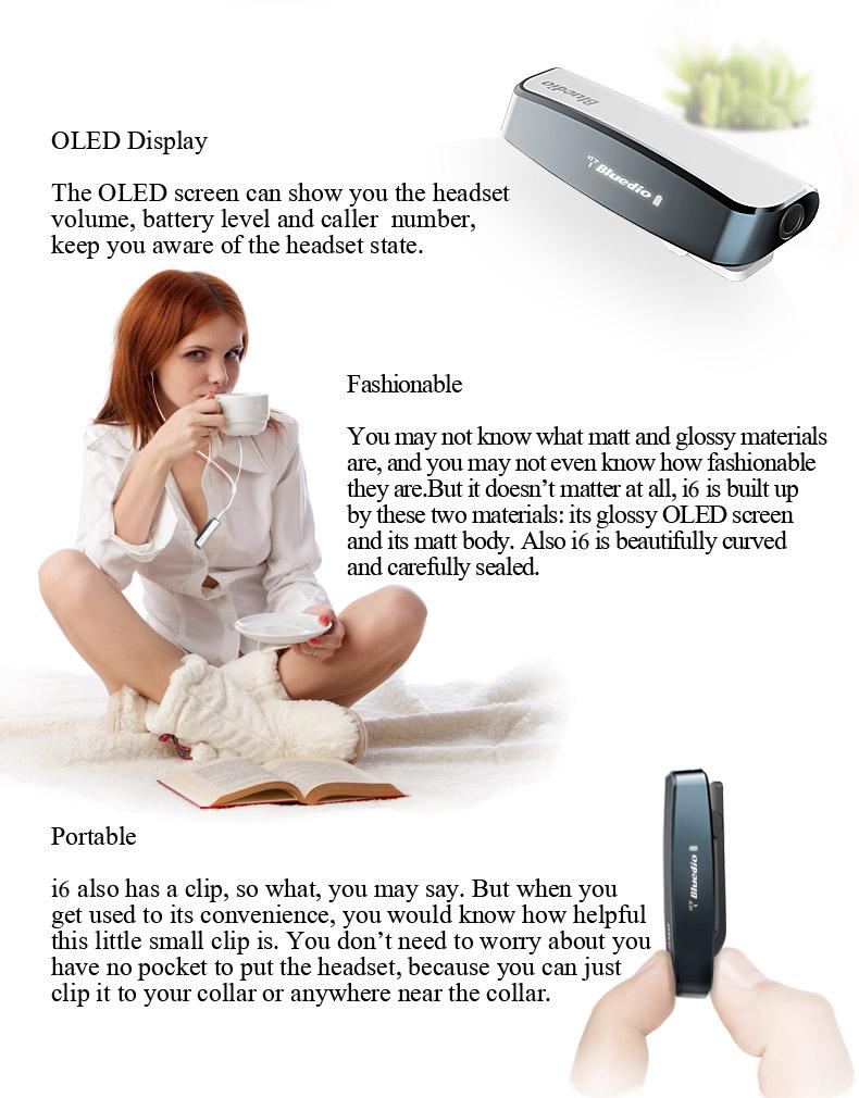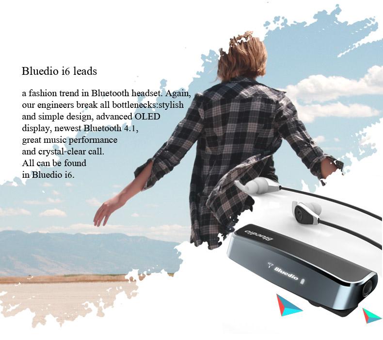 Bluedio i6, launches globally in Oct. 2014,leading a fashion trend in Bluetooth headset. Again, our engineers break allbottlenecks, striving to craft the best Bluetooth headset for you. Stylish andsimple design, advanced OLED display, newest Bluetooth 4.1, great musicperformance and crystal-clear call. All can be found in