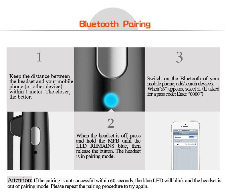 Short Description: Bluetooth version: V4.1 Supported profiles: A2DP,AVRCP,HSP,HFP,SPP Drive: 10mm Speaker impedance: 16 SPL: 110dB THD: <0.1% Frequency response: 20Hz-20KHz Operating distance: up to 10m Talk time: about 6hrs Music time: about 5hrs Standby time: about 100hrs Fully charged time: about 2hrs Headset size: 18*7*56mm Package size: 100*47*200mm Headset weight: 9g Package weight: 238g